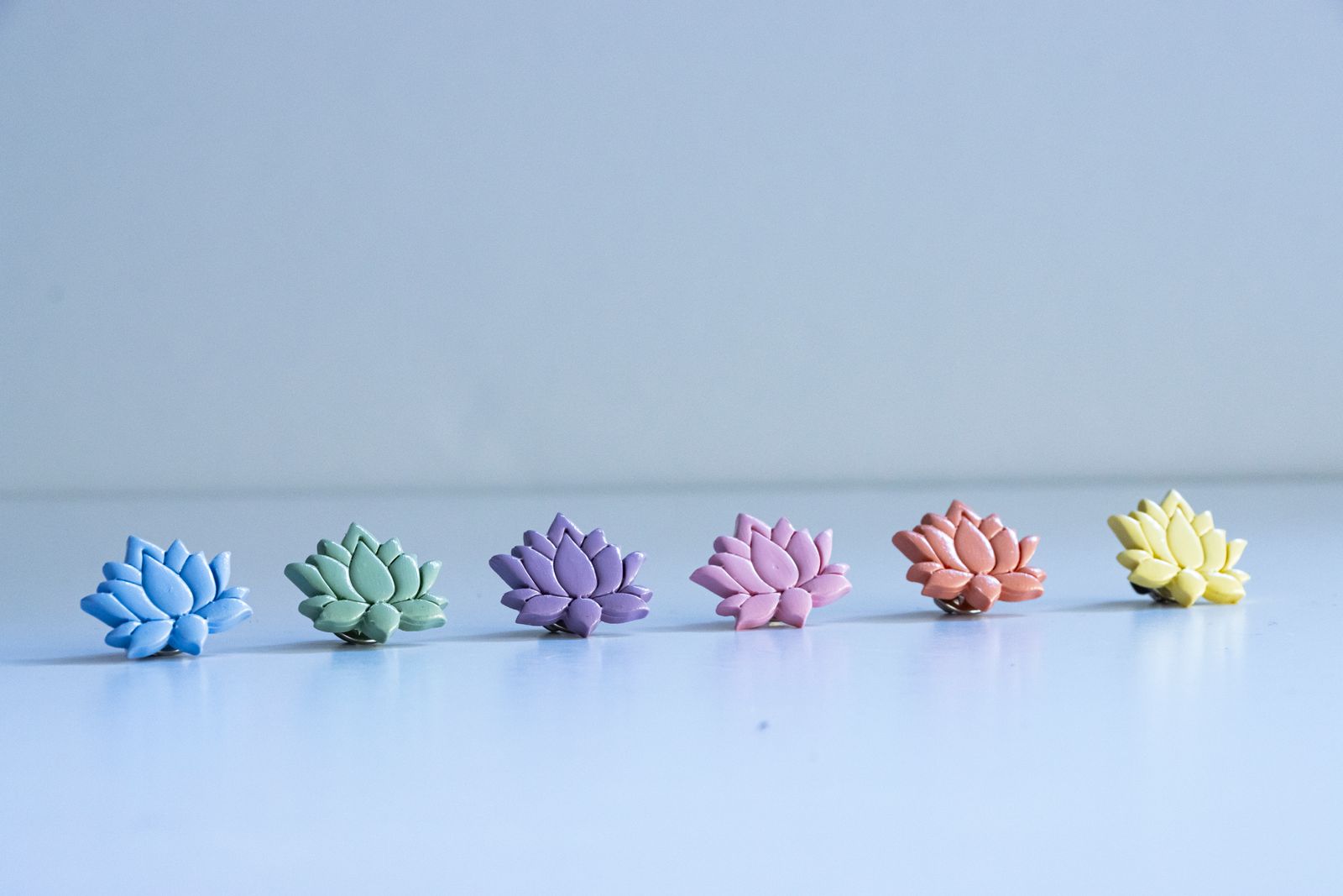 The lotus flower reminds us that something beautiful can grow even in the mud. Handmade with polymer clay and love, and available in 6 soft pastel colours. Each one is unique, just like you!